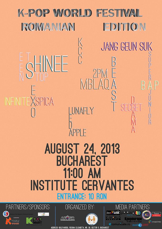 Pentru cei pasionati de cultura Coreei de Sud, K-pop World Festival ajunge si in Romania! Pe 24 august de la 11:00, la Insititutul Cervantes din Bucuresti va avea loc minievenimente de cultura si muzica moderna a Coreei de Sud. De la work-shopuri pana la un dance battle spectaculos. Acest festival de dans da sansa castigatorului sa plece in tara lui preferata.