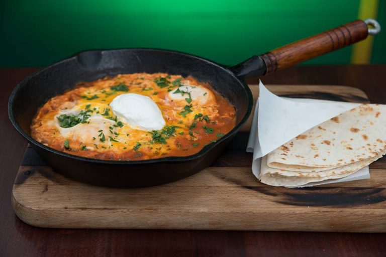 Mergem acum spre Jaxx, unde avem o opțiune de mic dejun pentru cei oleacă mai gurmanzi care nu se satură cu 1 ou. Ce ziceți de o tigaie plină cu ouă, legume proaspete, cheddar și un topping excelent de salsa și smântână? Se mai numește și Huevos Rancheros.