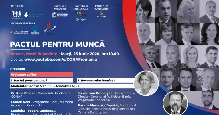 PACTUL PENTRU MUNCĂ. ÎMPREUNĂ RECONSTRUIM ROMÂNIA reunește, pentru prima dată la Brașov în cadrul dezbaterilor sale, reprezentanți ai tuturor actorilor implicați în piața muncii: patronate, sindicate, mediu academic și autorități. O inițiativă a Confederaţiei Naţionale pentru Antreprenoriat Feminin (CONAF) și Federaţiei Patronale Petrol şi Gaze (FPPG), cărora, din 2020, li s-a alăturat, ca partener strategic, Confederația Patronală CONCORDIA, PACTUL PENTRU MUNCĂ își propune să identifice noi provocări pe piaţa muncii și să vină cu soluții realiste și eficiente pentru realizarea unei Strategii coerente a forței de muncă pe termen mediu și lung.