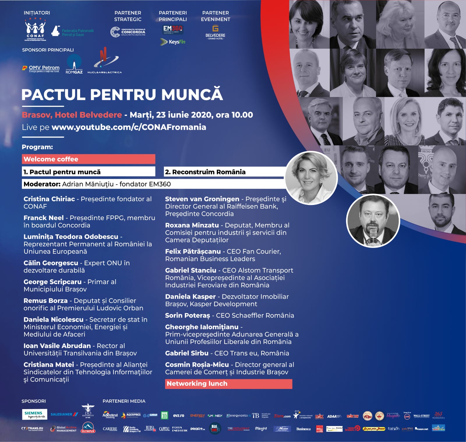 Printre invitați se numără Luminița Teodora Odobescu – Reprezentant Permanent al României la Uniunea Europeană, Călin Georgescu – Expert ONU în dezvoltare durabilă, Primarul Municipiului Brașov – George Scripcaru, Remus Borza – Deputat și Consilier Onorific al Premierului Ludovic Orban, Secretarul de stat în Ministerul Economiei, Energiei și Mediului de Afaceri – Daniela Nicolescu, Ioan Vasile Abrudan – Rector al Universității Transilvania din Brașov, Cristiana Matei – Președinte al Alianţei Sindicatelor din Tehnologia Informaţiilor şi Comunicaţii. De asemenea, sunt invitați Roxana Mînzatu – Deputat și Membru al Comisiei pentru industrii și servicii din Camera Deputaților, Felix Pătrășcanu – CEO Fan Courier, Romanian Business Leaders, Gabriel Stanciu – CEO Alstom Transport România, Vicepreședinte al Asociației Industriei Feroviare din România – AIF, Daniela Kasper – dezvoltator imobiliar Brașov – Kasper Development, Sorin Poteraș – CEO Schaeffler România, Gheorghe Ialomițianu fost Ministru al Finanțelor, Prim-vicepreşedinte al Adunării Generale a Uniunii Profesiilor Liberale din România – UPLR, Gabriel Sîrbu – CEO Trans eu România, Cosmin Roșia–Micu – Director General al Camerei de Comerț și Industrie Brașov, alături de Cristina Chiriac – Președinte fondator al CONAF, Franck Neel – Președinte al FPPG – inițiatorii proiectului PACTUL PENTRU MUNCĂ și Steven van Groningen – Preşedintele Confederației Patronale CONCORDIA – partener strategic al proiectului din anul 2020. Moderator al dezbaterii va fi jurnalistul Adrian Măniuțiu, fondator EM360.