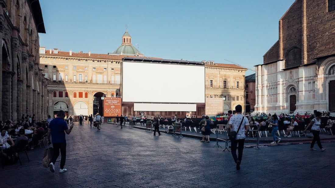 Piazza Maggiore, din cetatea Bologna, Italia, găzduiește un cinema în aer liber în întregime grandios. De la filme mute, la clasice alb-negru și până la producții contemporane de succes, Cineteca di Bologna propune o bogată colecție cinematografică.