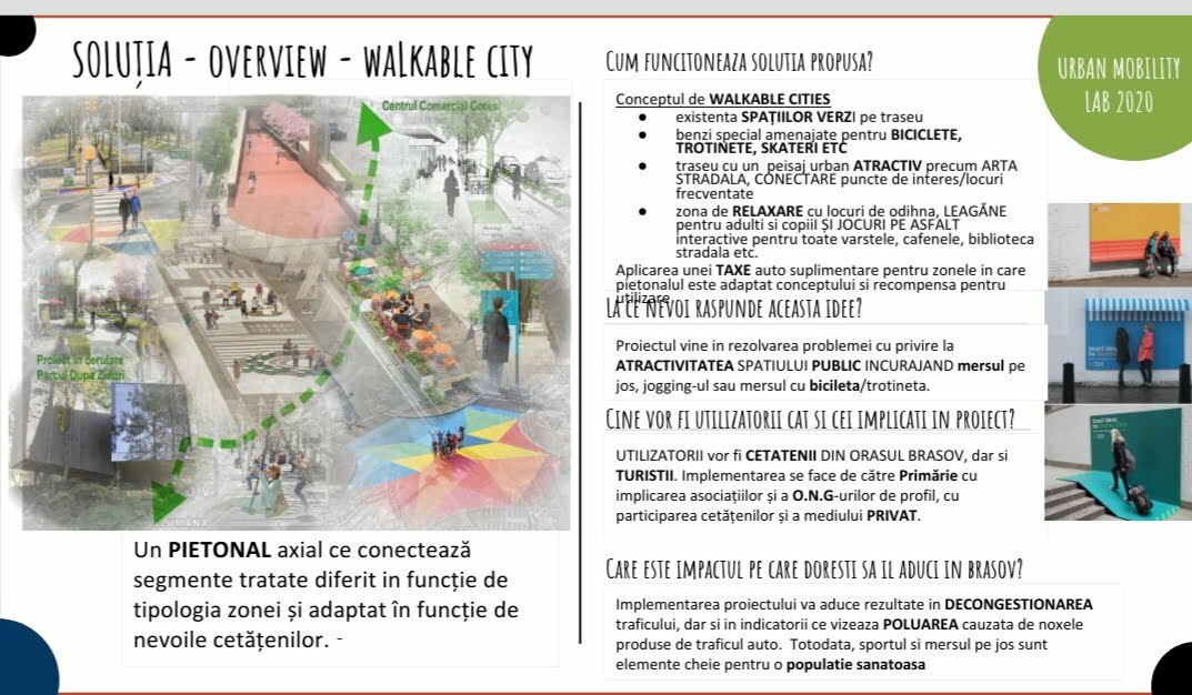 Eu și Dan Corolea, ne-am înscris în competiție pentru că vrem să vedem un Brașov mult mai aproape de ideea de Smart City. Pentru că vrem un Brașov sustenabil și pentru că suntem interesați de infrastructură, Dan chiar pasionat. Fiind un hakaton, echipele se formau inclusiv în timpul lui, așadar, ne-am bucurat că i-am cunoscut pe Alina Dogeanu, Mihaela Bănică și Sergiu Stemate, care au venit cu know-how pe partea de urbanism și arhitectură, pasionați și ei de dezvoltare urbană și orașe ale viitorului. I-am “cunoscut” e impropriu zis, pentru că am lucrat pe Zoom și pe WhatsApp, în cloud, pe Gdocs. Practic, am folosit toate minunile zilelor noastre, care micșorează distanțe și ajută la agregarea grupurilor și integrarea ideilor de noutăți conceptuale. Iar într-un fel, echipa a avut dinamica ei proprie, deși a fost una construită în mediul acesta online fără niciun fel de interacțiune fizică. Ne-am numit Urban Concept iar proiectul la care am lucrat Walkable City.
