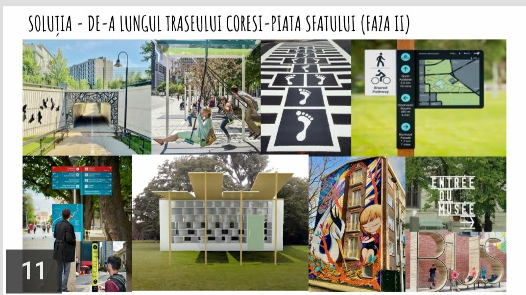 Ideea noastră s-a concentrat pe pieton, pe un oraș aerisit, pe spații pietonale interconectate, pe shared-spaces și atractivitate în definirea unui proiect pietonal particular. Noi am propus un traseu axial care să conecteze viitorul Parc Cultural După Ziduri de Zona Coresi, trecînd pe la noul AFI Mall. Pe lângă lărgirea spațiilor pietonale, introducerea benzilor dedicate pentru biciclete și alergat, ne-am gândit la un sistem de recompensare a celor care folosesc pietonalul. Iar pietonalul nu este gândit ca o stradă cu asfalt gri, este proiectat prietenos, cu insule de verdeață care absorb noxele, cu arbori la fel – tei, arțari norvegieni, este colorat și are iluminare cu energie solară, are spații de relaxare și odihnă, are terase. Am gândit proiectul în așa fel, deoarece orașele trebuiesc reorganizate în context pandemic, cu atenție concentrată pe transportul alternativ, cu promovarea mișcării în aer liber ca mijloc de prevenție în păstrarea sănătății, dar și cu atenție pentru ideea clară de dezvoltare durabilă a orașului, lucruri cvasi-ignorate până de curând.