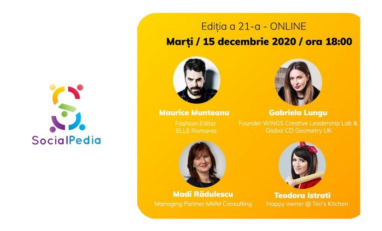 Ediția 21 a SocialPedia, singura conferință lunară de social media din România, are loc pe 15 decembrie 2020, de la ora 18:00, live pe ZOOM.