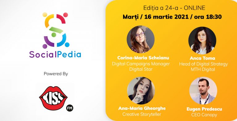 SocialPedia revine în forță cu o nouă ediție adaptată noului context, online. Ediția 24 a SocialPedia are loc pe 16 martie 2021, de la ora 18:30, live pe ZOOM. Speakerii acestei ediții cu tema “PPC Marketing & SEM” sunt: Corina-Maria Scheianu – Digital Campaigns Manager Digital Star, Eugen Predescu – CEO Canopy, Ana-Maria Gheorghe – Creative Storyteller, și Anca Toma – Head of Digital Strategy MTH Digital.