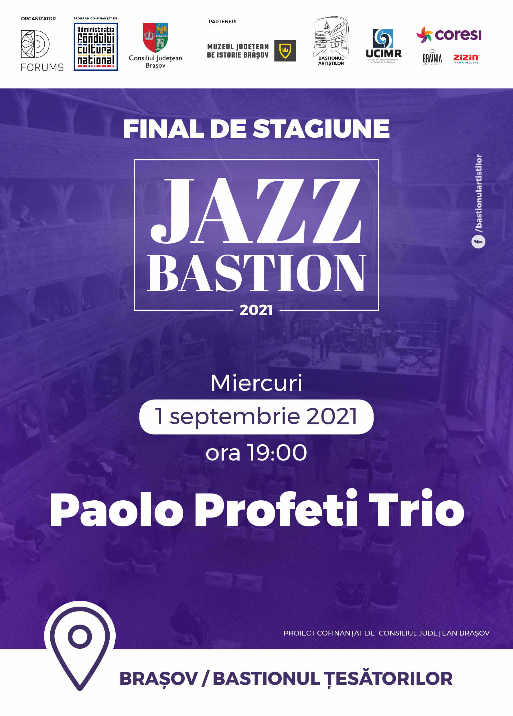 Jazz Bastion 2021 este un proiect al Asociației Forums realizat împreună cu Muzeul Județean de Istorie Brasov și Uniunea de Creație Interpretativă a Muzicienilor din România, cofinantat de Administrația Fondului Cultural Național și Consiliul Județean Brașov și sprijinit de doi parteneri locali foarte implicați în comunitatea brașoveană, Coresi Shopping Resort și Apemin Zizin.