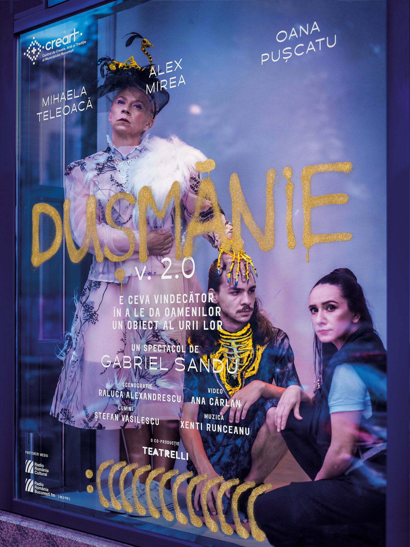 Pe 13 și 14 decembrie sunt programate la Teatrelli avanpremiera, respectiv premiera spectacolului scris și regizat de Gabriel Sandu – „Dușmănie v.2.0. E ceva vindecător în a le da oamenilor un obiect al urii lor”, într-o nouă versiune, dintr-o perspectivă artistică diferită și cu o nouă distribuție: Mihaela Teleoacă, Oana Pușcatu și Alex Mirea.