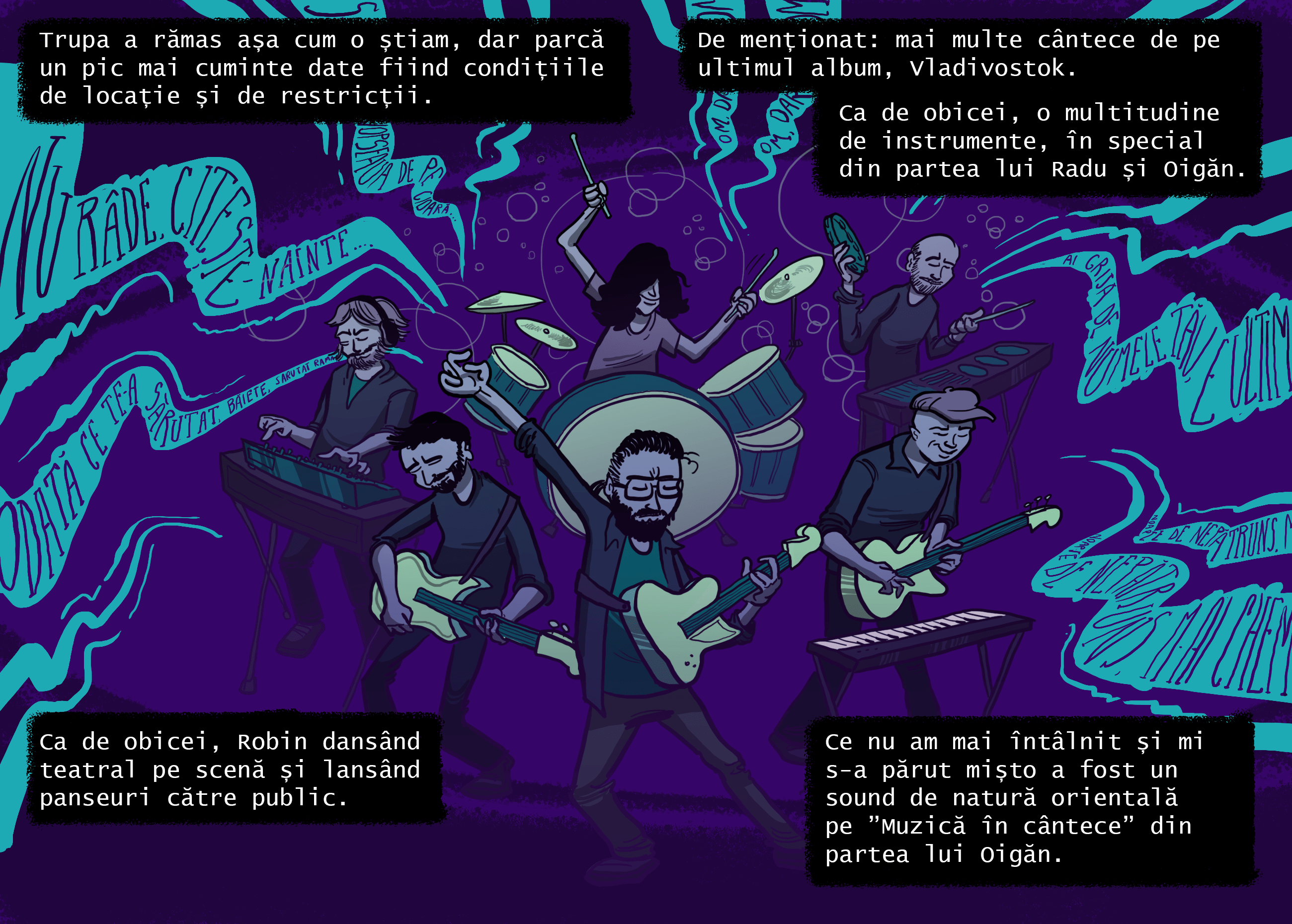 Alt proiect de-al meu pe care vreau să-l menționez este colaborarea mea cu site-ul de muzică românească alternativă CriticEyez. Când am descoperit CriticEyez cred că am pierdut câteva zile stând doar pe site. Răzvan Patachi, capul răutaților, face recenzii de albume, merge la concerte, ia interviuri, și, partea mea preferată, ocazional postează o listă cu cele mai recente lansări din scena autohtonă de muzică. Eu sunt mare fan de muzică, îmi place să descopăr chestii obscure sau cât mai underground, eventual și cât mai originale, așa că listele centralizate ale lui Răzvan au fost adevărate comori ascunse pentru mine. Inspirat de niște reportaje sub formă desenată și cu dorința de a contribui cumva la susținerea scenei muzicale autohtone, i-am propus în 2019 lui Răzvan să fac niște recenzii desenate pentru CriticEyez. Și de atunci, a devenit un feature ocazional pe care îl fac cu plăcere. Pe scurt, mă duc la un concert, și o săptămână mai târziu, apare recenzia concertului pe site. Da, nu are același impact al momentului ca un reportaj care apare a doua zi, dar îmi place să cred că avantajul meu este grafica, și faptul că pot să exprim niște lucruri prin desen care nu pot fi exprimate la fel de ușor prin fotografii sau text. Regula mea este să fie un artist român, nimic din mainstream (deși am fentat un pic cu Robin and the Backstabbers și Dora Gaitanovici) și să fiu sincer. Momentan m-am plimbat majoritar în București, singurul din provincie fiind la un concert Alexu and the Voices Inside, la Aiurea’n’Parc. Până acuma a mers bine, mi-am găsit un ritm. Pandemia m-a blocat major în ultimii doi ani, dar sper să revin în forță anul ăsta.