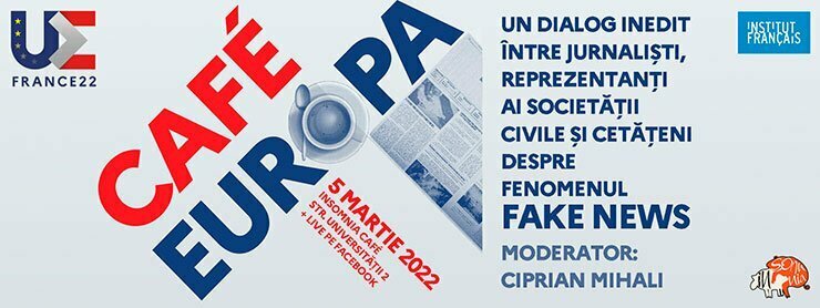 Café Europa 2022 este un eveniment despre libertatea presei, organizat de Franța în cele 27 de țări europene ale UE, în cadrul președinției franceze a Consiliului Uniunii Europene. În 5 martie 2022, în peste 30 de orașe din Europa și în 7 orașe din țară, mai multe cafenele emblematice pentru tradiția europeană a schimbului de idei vor găzdui discuții între jurnaliști și cetățeni pe tema libertății presei și a fenomenului fake news. În acest context, Institutul Francez din România la Cluj-Napoca propune o dezbatere despre dezinformarea în pandemie și în situații de criză cu jurnaliști, reprezentanți ai societății civile și formatori de opinie.