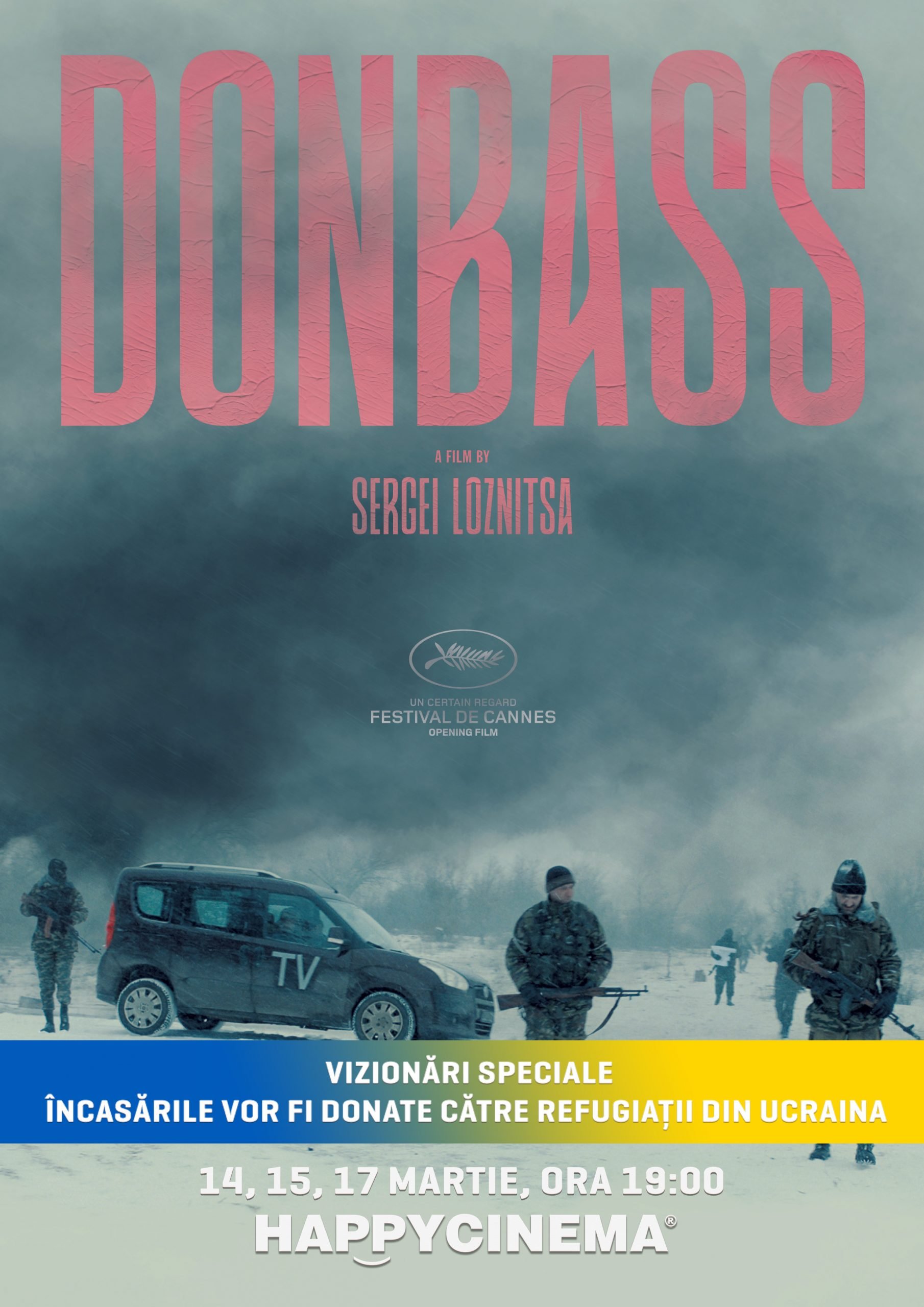 În semn de solidaritate cu criza umanitară a refugiaților de război din Ucraina, Happy Cinema împreună cu Digital Cube organizează trei proiecții speciale ale filmului Donbass în zilele de 14, 15 și 17 martie, de la ora 19.00. Filmul va putea fi vizionat în toate cele opt cinematografe Happy Cinema din România, din București, Alexandria, Buzău, Bacău, Bistrița, Focșani, Vaslui și Botoșani.