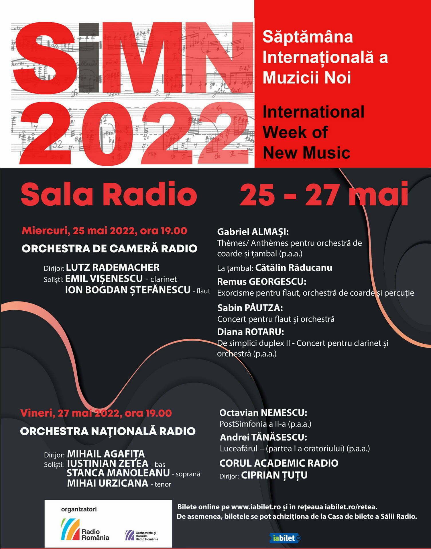 După doi ani de întrerupere din motive pandemice, revine în atenția publicului SĂPTĂMÂNA INTERNAȚIONALĂ A MUZICII NOI, eveniment anual dedicat creației contemporane ajuns la ediția cu numărul 31. Organizat de Ministerul Culturii, Uniunea Compozitorilor și Muzicologilor din România, UCMR-ADA, Radio România și Universitatea Națională de Muzică București, având mai mulți parteneri tradiționali din sfera instituțiilor de cultură și media, festivalul Săptămâna Internațională a Muzicii Noi se va derula între 22-29 mai 2022 la Universitatea Națională de Muzică din București și la Radio România. Două dintre ansamblurile muzicale ale radioului public vor lua parte la festival, prin două seri muzicale desfășurate la Sala Radio.