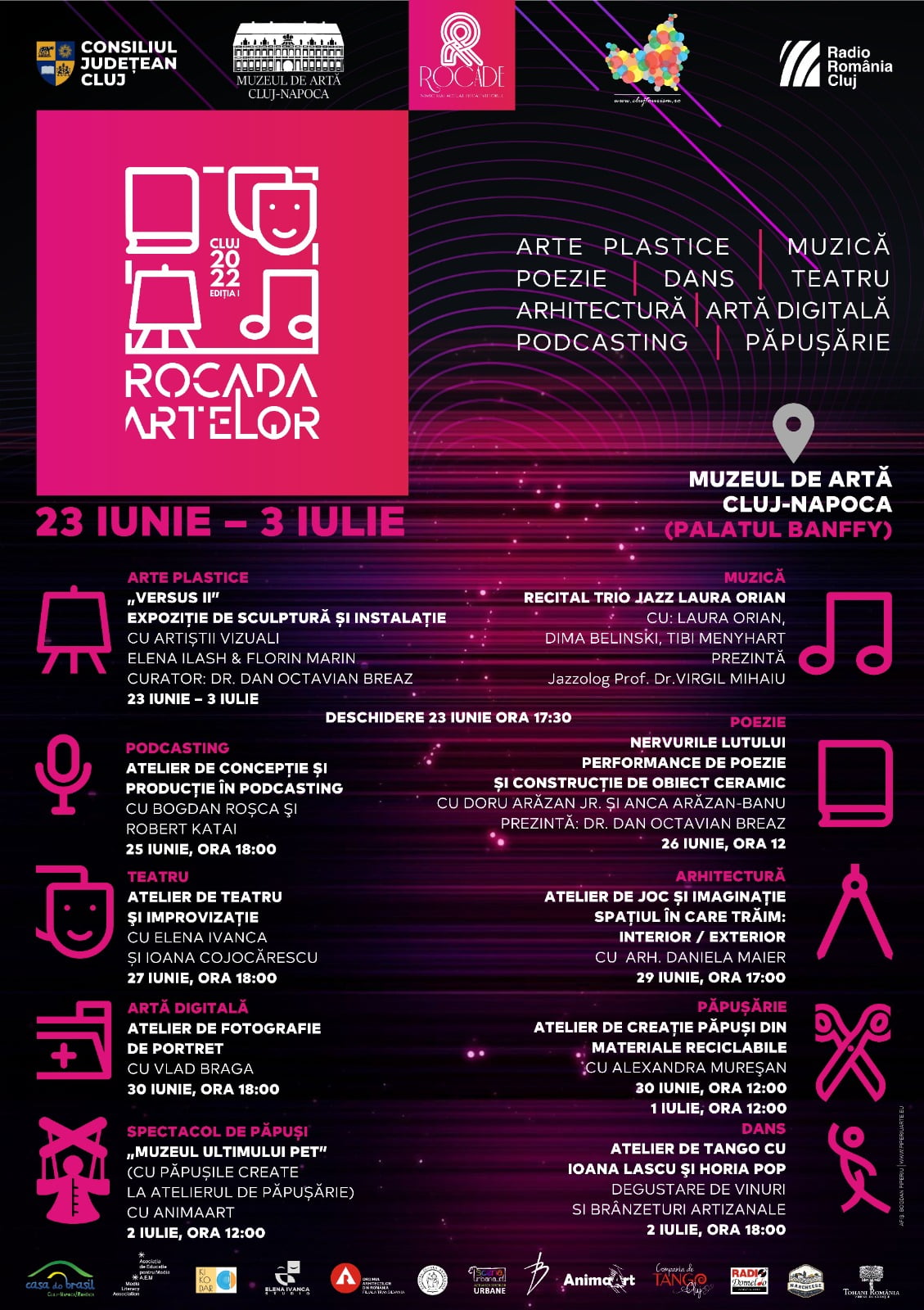 Prima ediție a festivalului ROCADA ARTELOR va avea loc în perioada 23 iunie − 3 iulie 2022 și va fi găzduită de Muzeul de Artă Cluj-Napoca: sculptură și jazz, poezie și obiect ceramic, teatru de improvizație, arhitectură, fotografie și artă digitală, podcasting, tango și păpușărie, toate pentru fiecare și în fiecare din toate.