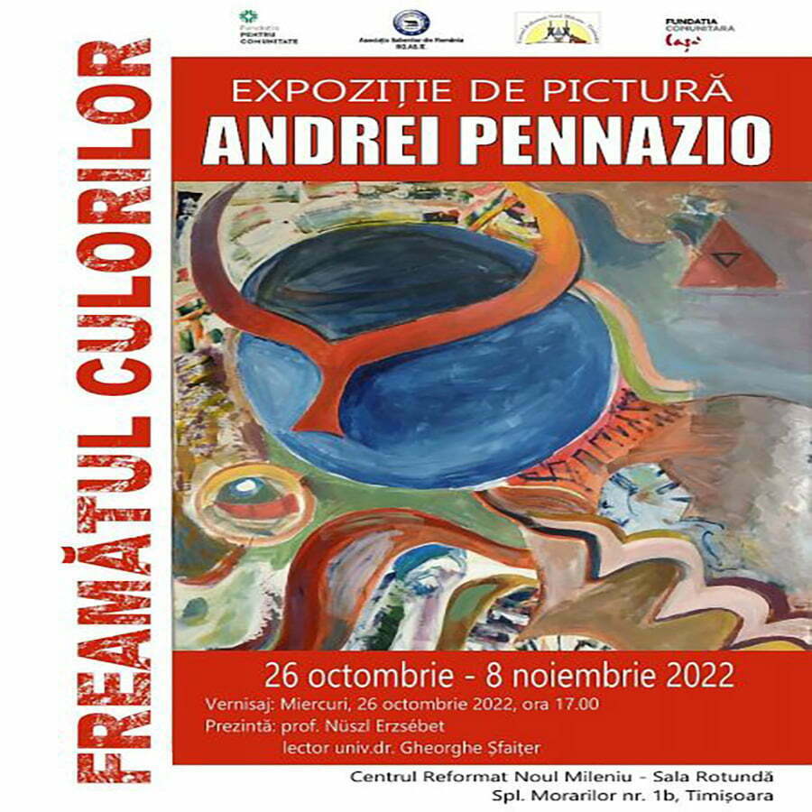 Tânărul artist Andrei Penazzio, elev al Colegiului de Artă „Octav Băncilă” din Iași – secția design industrial, va prezenta la Timișoara expoziția personală „Freamătul culorilor”, al cărei vernisaj va avea loc în 26 octombrie, ora 19,00, la Centrul Reformat Noul Mileniu de pe strada Morarilor nr. 1b.