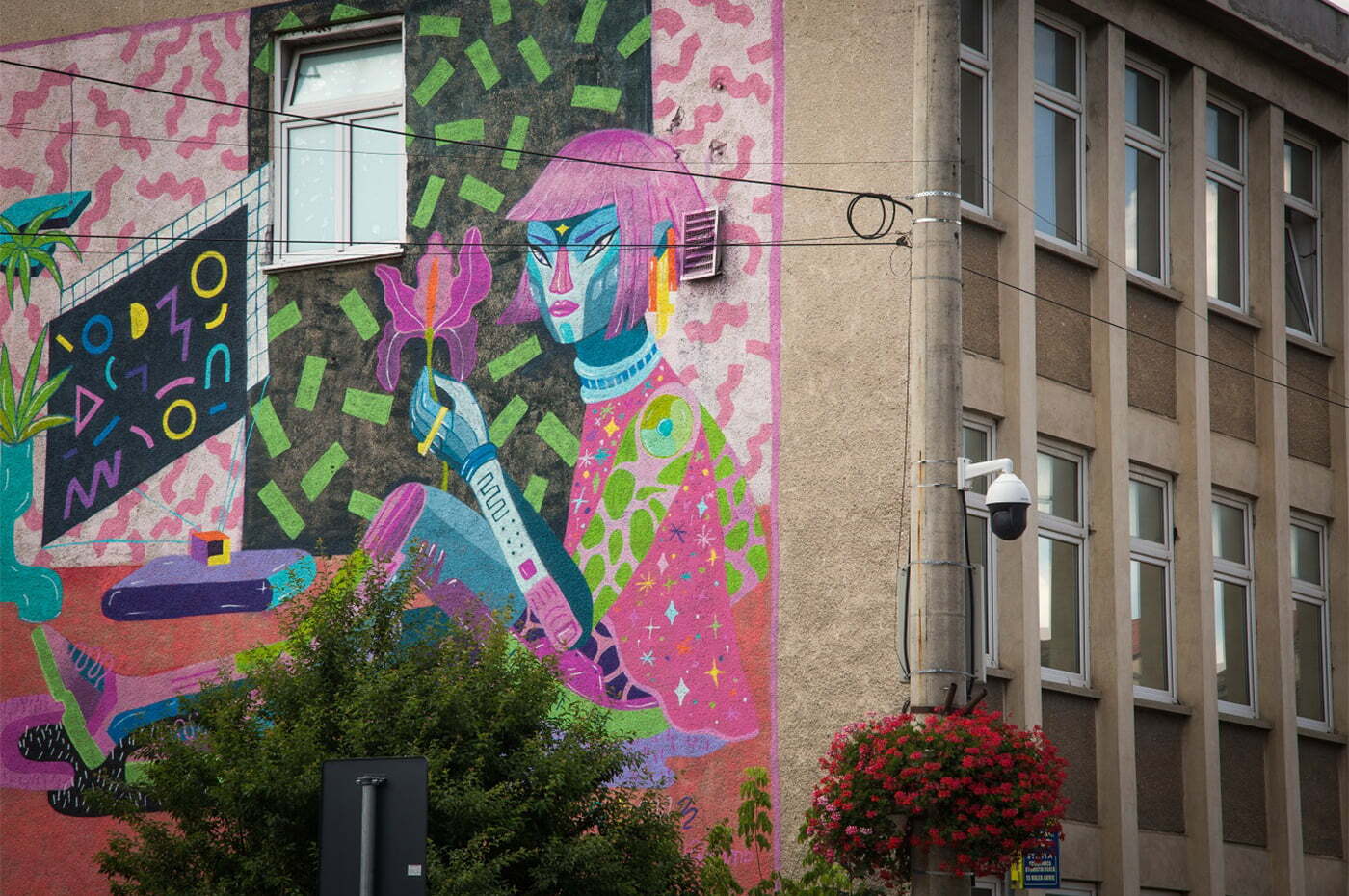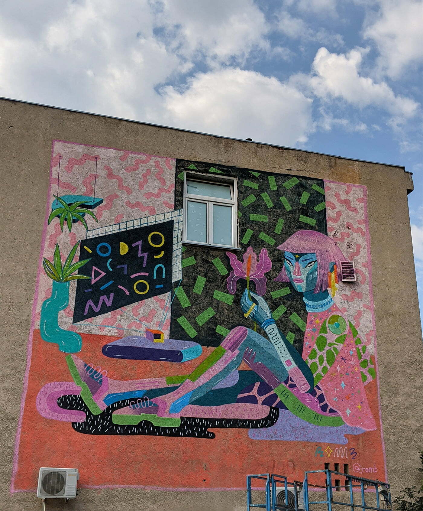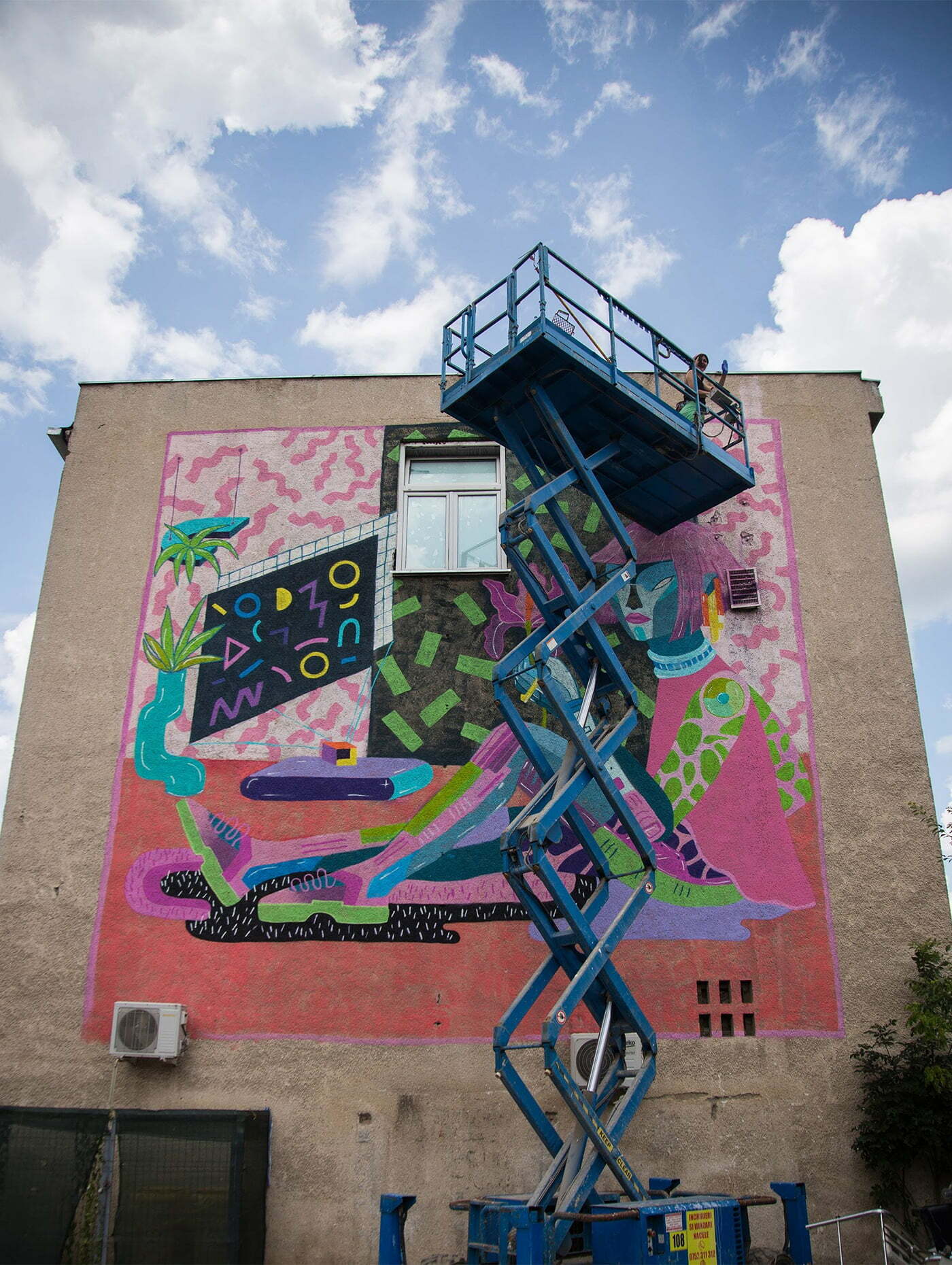 Tot aceasta e lucrarea care mi-a ridicat cele mai mari provocări, mai ales fizic, fiind de dimensiuni destul de mari și ceva nou pentru mine. Lucrarea se găsește pe un perete exterior al Centrului Stomatologic Universitar din Sibiu. În cele 5 zile în care am lucrat la ea am învățat să conduc o nacelă pe teren accidentat, am trecut peste frica de înălțime și am mai învățat detalii tehnice pentru pictura pe pereți. Lucrarea reprezintă un robo-personaj feminin în camera ei colorată și futuristă. Sper să mai fac astfel de lucrări, mi-a plăcut mult și, deși e solicitant, merită. Fiecare lucrare are provocările ei, mai mari sau mai mici, și cred că asta e o parte din farmec.
