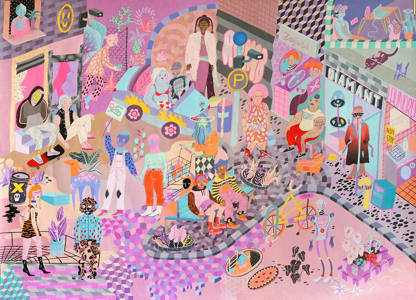 Procesul meu e unul organic, încep cu o idee despre ce vreau să pictez, care se clarifică pe măsură ce lucrez. Îmi stârnesc imaginația teme diverse, de la tehnologie la mitologie, trecând prin sci-fi, internet, magie, vise, natură, curcubee, modă, București și alte locuri pe care le vizitez. Uneori văd ceva ce îmi place, o textura, un obiect, o combinație de culori, pe care le trec prin filtrul propriu și apoi le transpun pe hârtie.