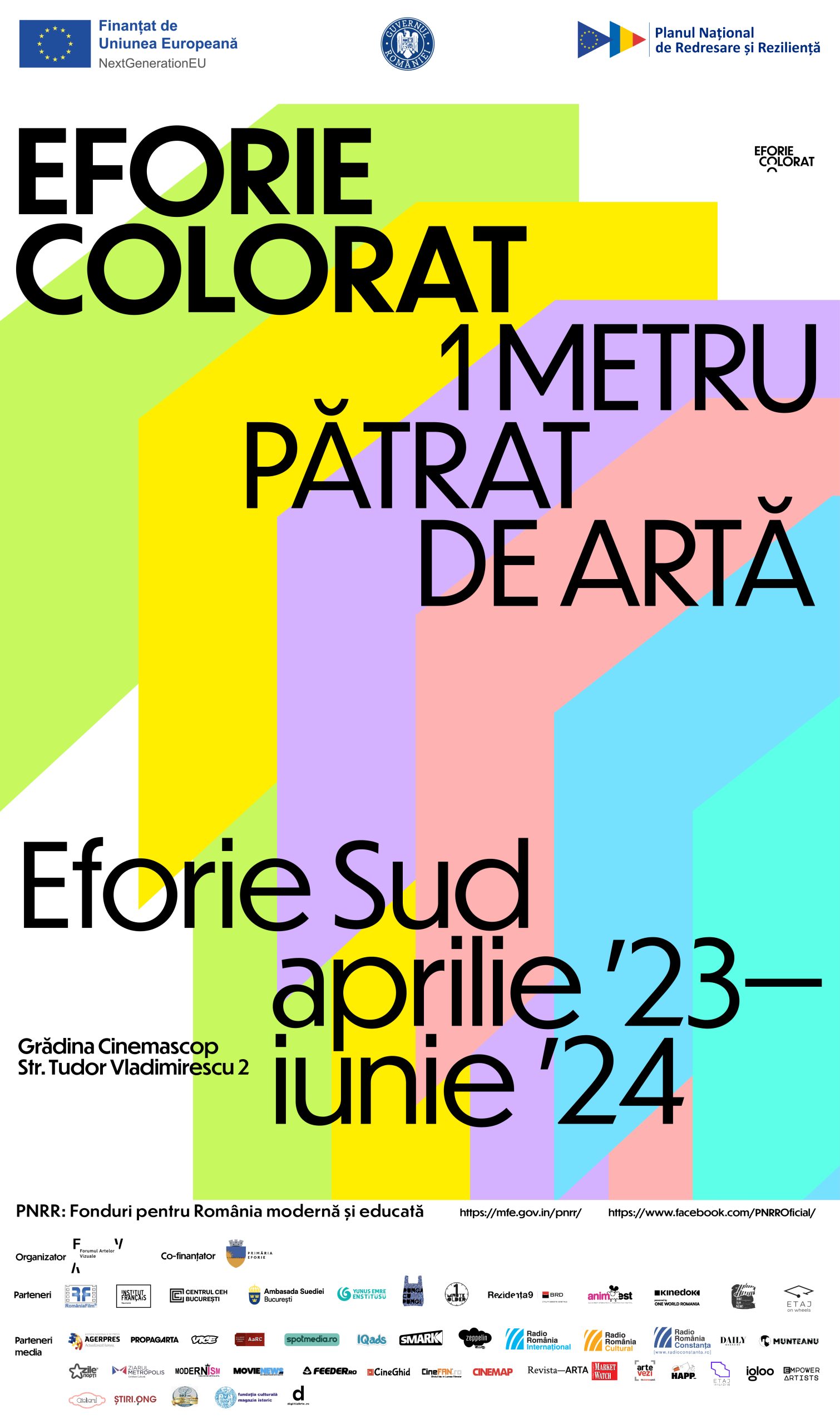 Centrul cultural Eforie Colorat 1 Metru Pătrat de Artă va funcționa pe toată perioada anului în Eforie Sud. Potrivit programărilor inițiale, principalele repere în perioada iunie 2023 – iunie 2024 sunt: