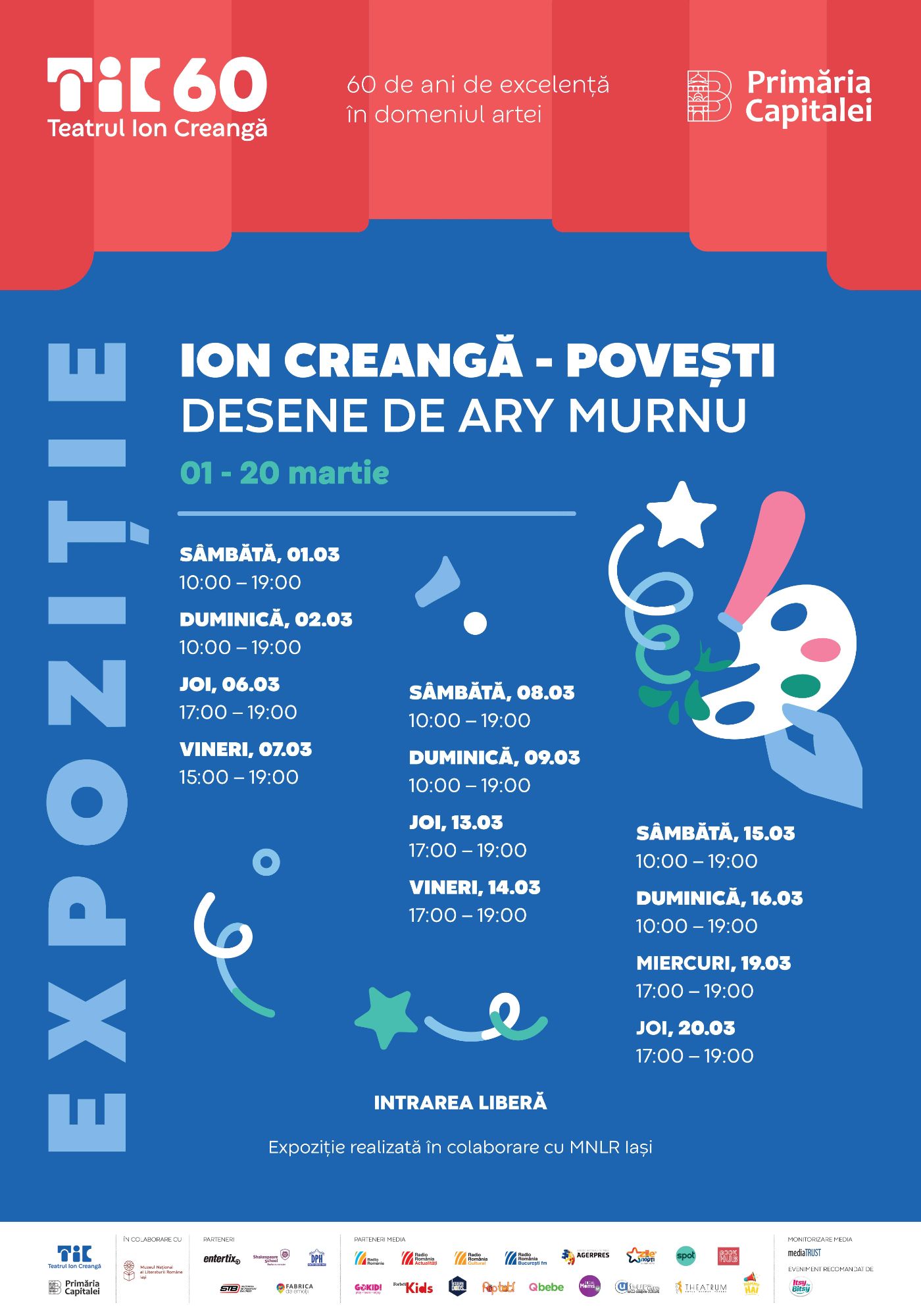 Realizată în parteneriat cu Muzeul Național al Literaturii Române din Iași, Expoziția „Ion Creangă – Povești. Desene de Ary Murnu” poate fi văzută, în foaierele Sălii Mari din str. Piața Amzei nr. 13, din 1 martie până pe 20 martie inclusiv. Conține o serie de ilustrații rare, din patrimoniul MNLR, ale unor scene-cheie din mai multe povestiri ale autorului „Amintirilor”.