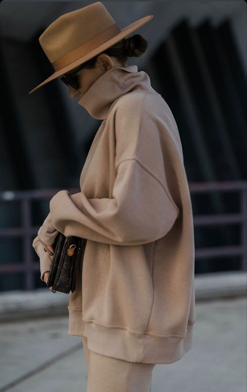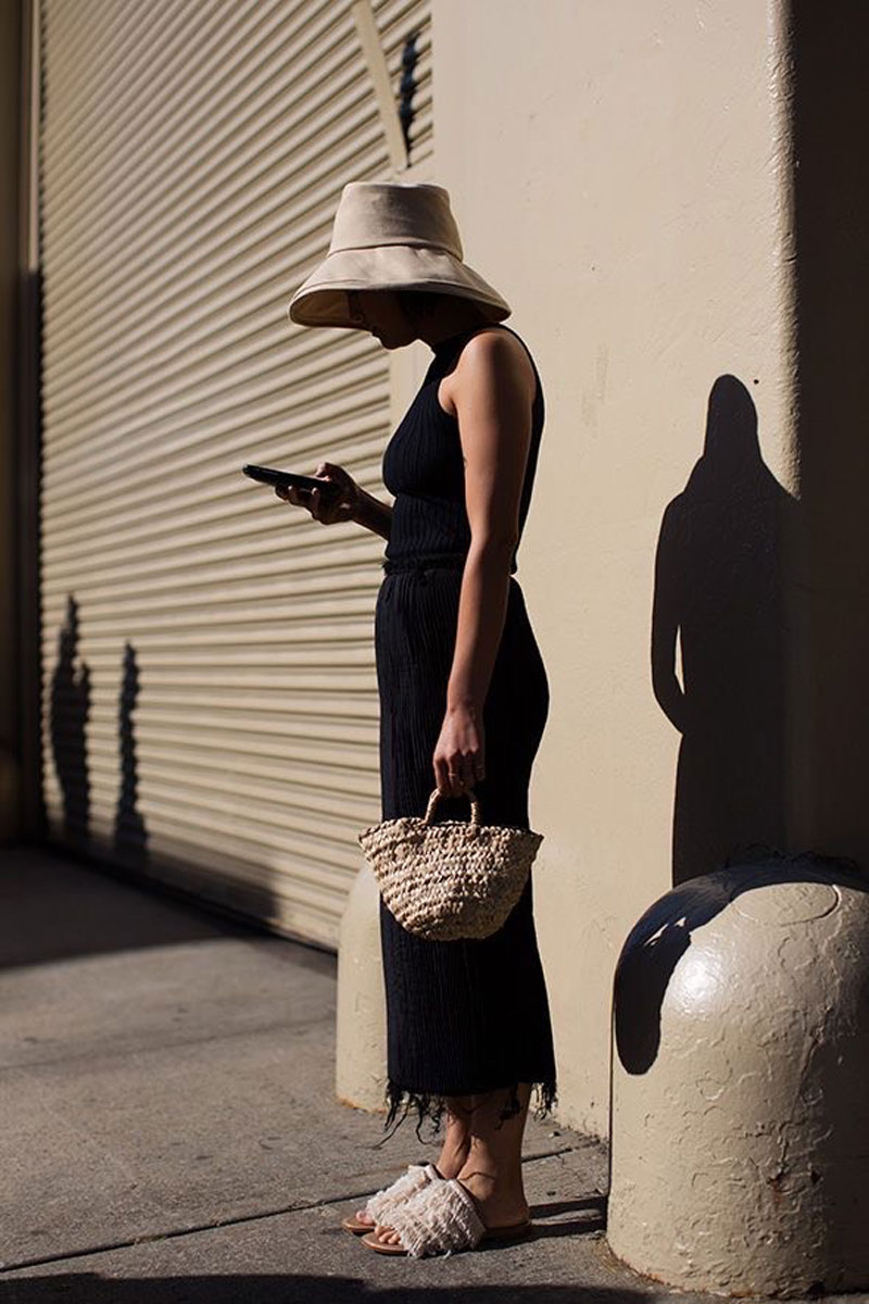 Pentru tendințele din 2025, un outfit minimalist, împreună cu o pălărie îndrăzneața crează echilibru.
