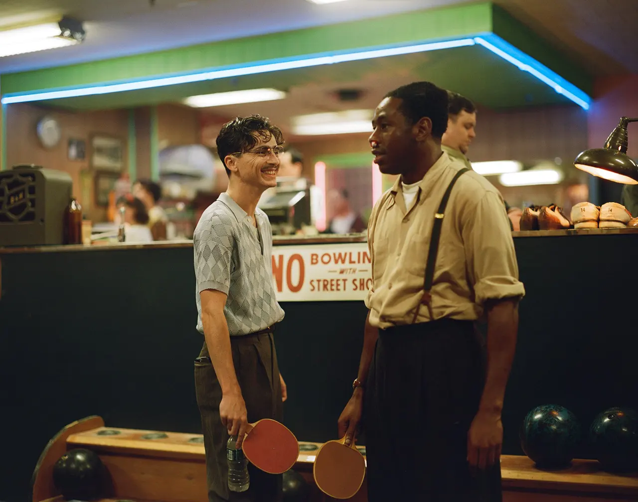 Chalamet, aici sub numele de Marty Mauser, are ochelari, un început de „mono sprânceană”, o ușoară acnee și o tentativă de bărbiță cu mustață. Pletele în vânt și chipul angelic din Dune sau Call Me By Your Name au lăsat locul unei apariții mult mai dure, mai neîngrijite și mai bine potrivite peisajului din New York-ul anilor ’50, acolo unde are loc acțiunea filmului.