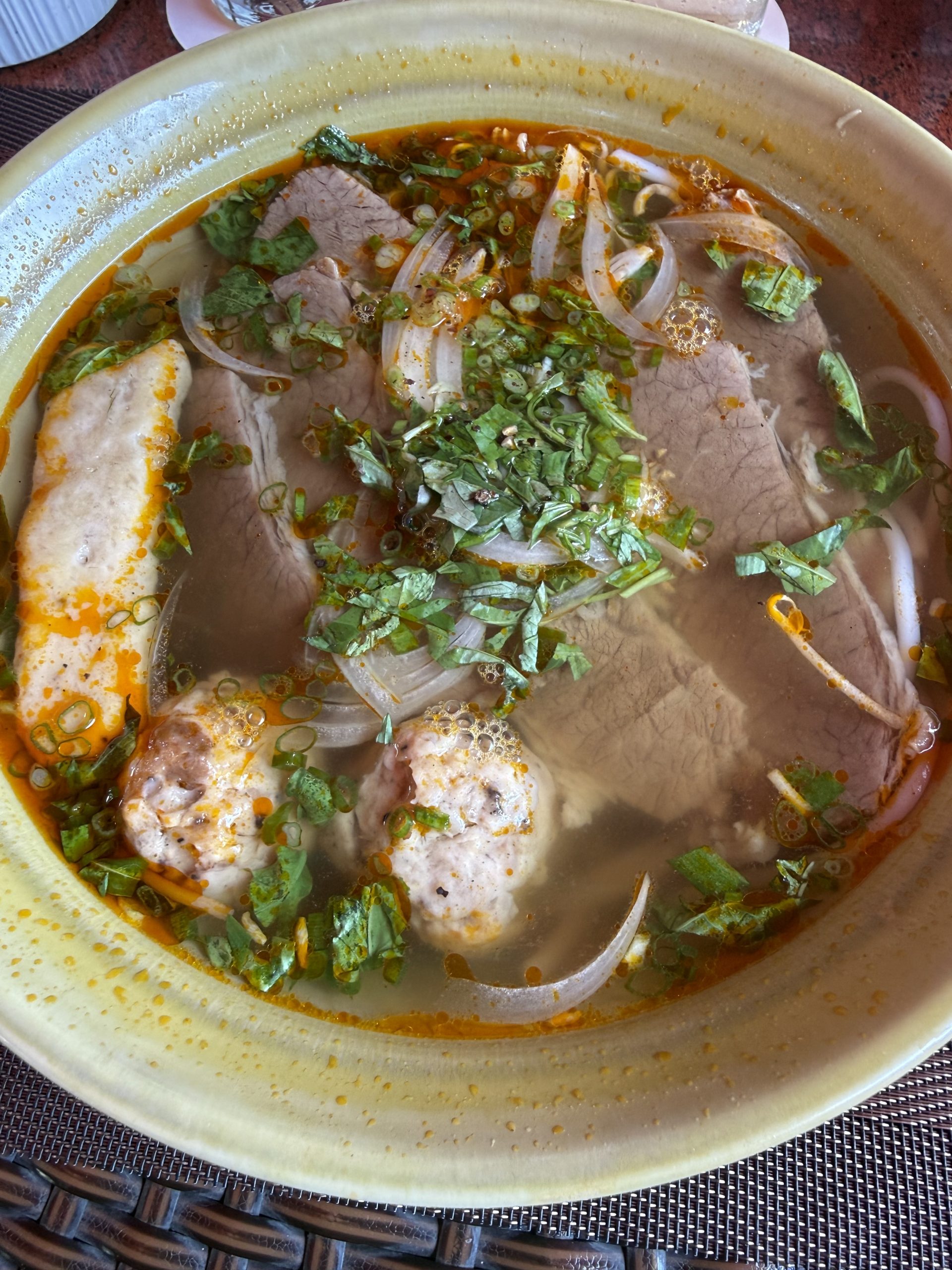 Supa avea carne de vită, găluște și tăiței de orez. Mai gălbuie decât ce mâncasem în Saigon, mai puțin intensă, dar cu gust rotund, ușor dulceag, cu coriandru și umami. Găluștele au fost surpriza, iar tăițeii aveau textura aceea elastică pe care o recunoști imediat. A fost, fără exagerare, cel mai bun mic dejun din toată călătoria.