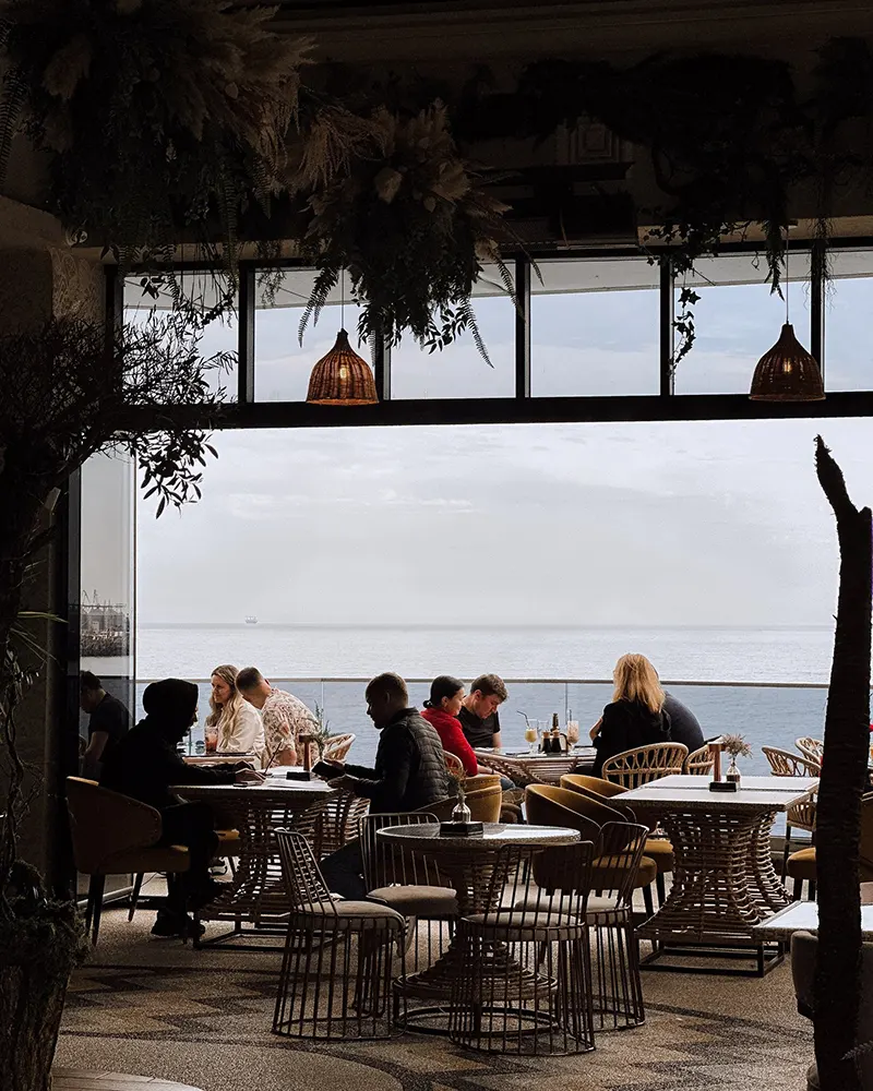 Terasa rooftop de aici oferă exact ce promite numele: o perspectivă deschisă, vedere spre Cazinoul din Constanța, aer, spațiu și senzația că orașul rămâne undeva jos, în plan secund. E locul unde sezonul cald începe cu adevărat, chiar și înainte ca plajele să se umple.