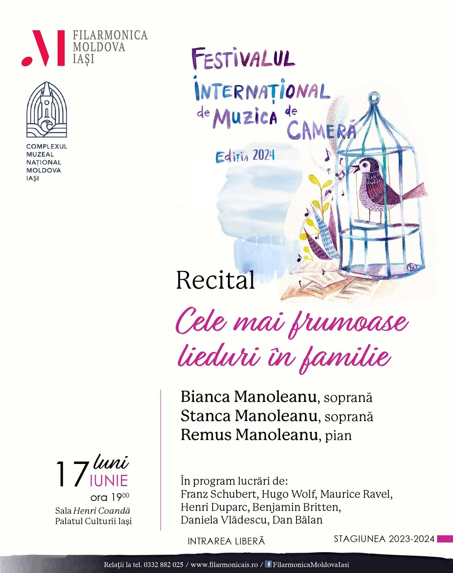 ⚜️Luni, 17 iunie 2024, la Sala Henri Coandă, festivalul va debuta cu un recital de lieduri susținut de artiștii Bianca Manoleanu și Stanca Manoleanu, acompaniați la pian de Remus Manoleanu. Programul lor va traversa epoci și emoții, de la sensibilitatea liedurilor lui Franz Schubert, incluzând celebrul Erlkönig, la intensitatea și diversitatea ciclurilor de lieduri spaniole ale lui Hugo Wolf. Nu vor lipsi din repertoriu nici creațiile romantice ale lui Henri Duparc și Cinq mélodies populaires grecques aduse la viață de Maurice Ravel, culminând cu rafinamentul liedurilor din ciclul Les Illuminations de Benjamin Britten.
