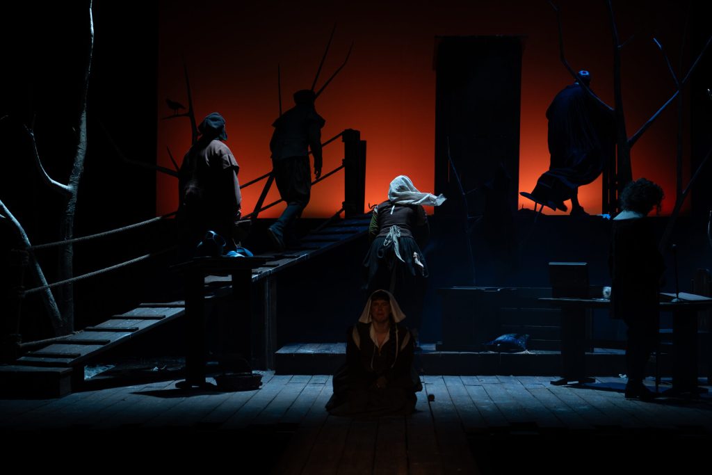 Universul vizual, imaginat de scenografa Ioana Pashca, plasează acțiunea într-o atmosferă densă, de inspirație flamandă. Trimiterea la pânzele lui Bruegel nu este întâmplătoare, scena devine o lume carnală, telurică, populată de o umanitate imperfectă, surprinsă în toată vitalitatea și derizoriul ei. Decorul funcționează ca un martor tăcut, un spațiu temporar – un „zid împrumutat” – care amplifică senzația de lume întoarsă pe dos, unde sacrul și profanul, legea și fărădelegea se confundă.
