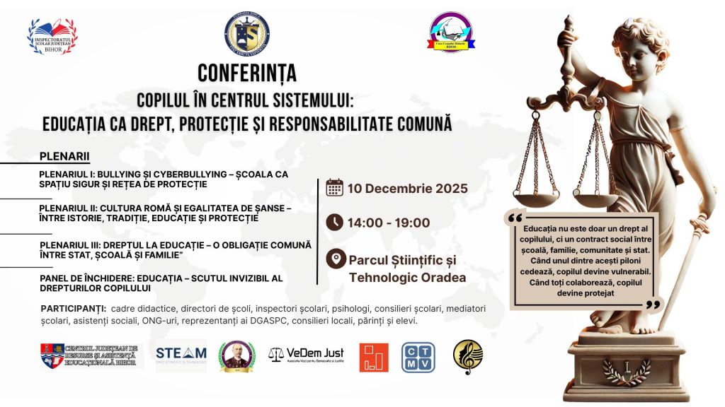 CONFERINȚĂ EDUCAȚIONALĂ • INVITAȚIE OFICIALĂ COPILUL ÎN CENTRUL SISTEMULUI: EDUCAȚIA CA DREPT, PROTECȚIE ȘI RESPONSABILITATE COMUNĂ 10 decembrie 2025 | 14:00 – 19:00 | Oradea Comunitatea educațională din Bihor se reunește într-un eveniment esențial pentru toți cei care lucrează cu și pentru copii.Te invităm să participi la o conferință care pune în centrul atenției copilul – nu ca […]